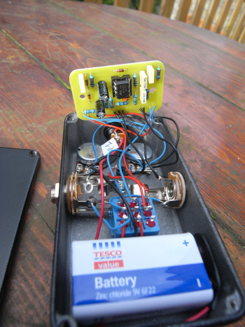 I finished this distortion pedal this afternoon (I'd soldered the PCB a couple of days ago, which took about 2 hours). Total construction time, approx 6 hours. Drilling the enclosure was the most difficult bit, as all the drill bits have been comprehensively blunted by someone drilling metal pedal enclosures in the past. The MXR dist + is a brilliant transparent-sounding distortion, with a medium amount of gain, that preserves the nuances and clarity of your playing. This kit sounds like my old block-logo one, but the Dunlop reissue is also very good no matter what some people might say on teh internets.The kit, which I heartily recommend, is only €19 from here. Add a box for a bit more. The enigmatic black box is €10, but I think it's worth it.