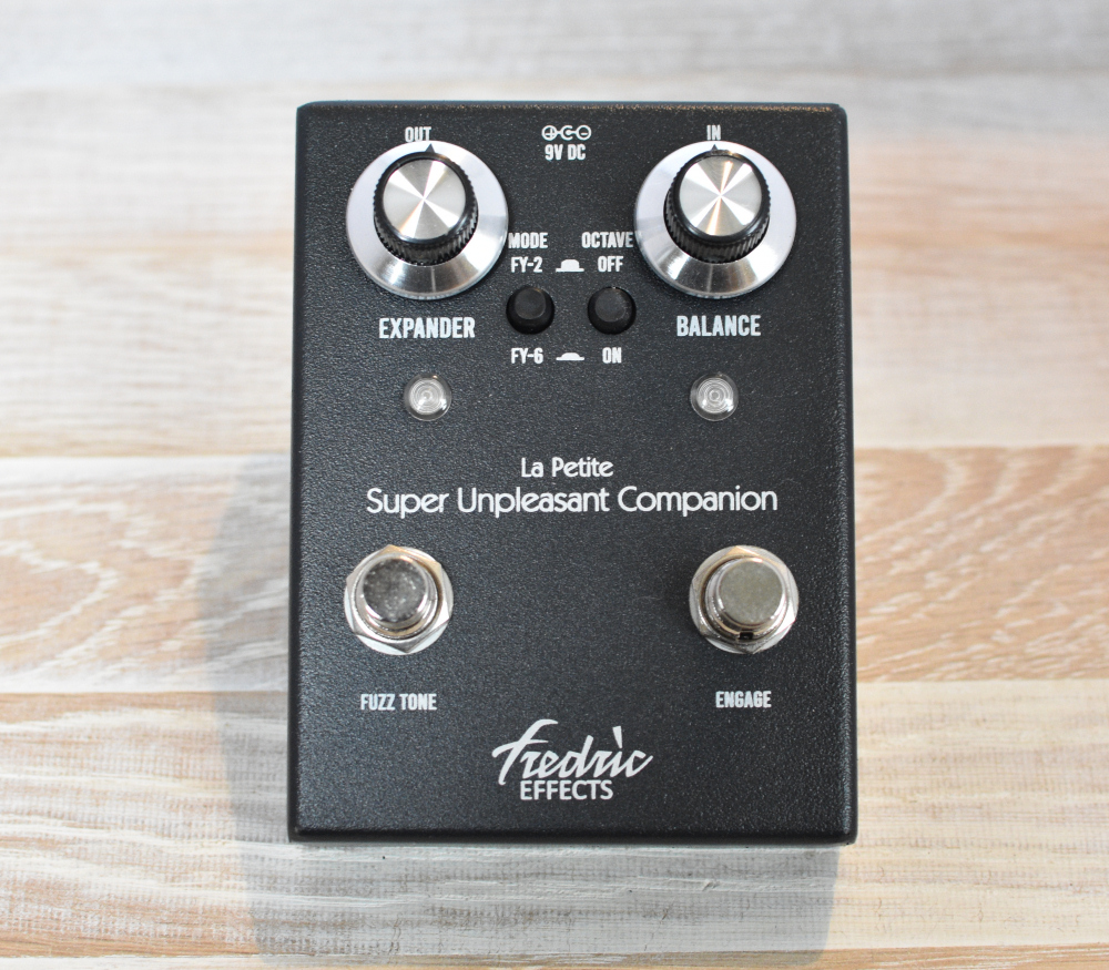 The Fredric Effects Petite Super Unpleasant Companion is a combined Shin-Ei FY-2 Companion Fuzz and FY-6 Superfuzz in a custom enclosure which is smaller than our Classic Super Unpleasant Companion. It features top-mounted jacks and has the controls on the front face.