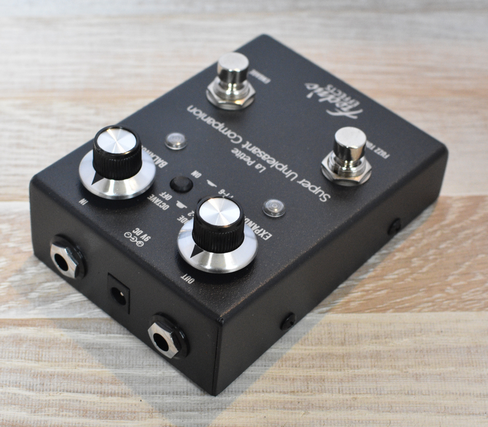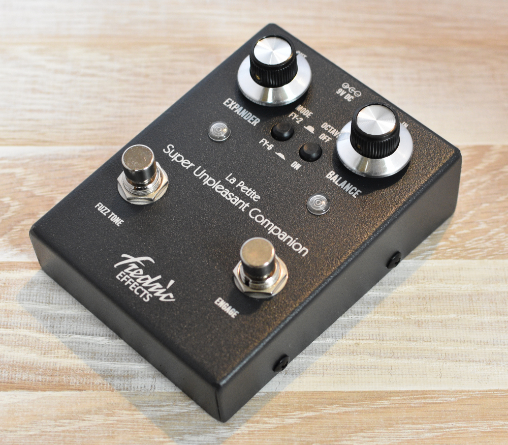The Fredric Effects Petite Super Unpleasant Companion is a combined Shin-Ei FY-2 Companion Fuzz and FY-6 Superfuzz in a custom enclosure which is smaller than our Classic Super Unpleasant Companion. It features top-mounted jacks and has the controls on the front face.